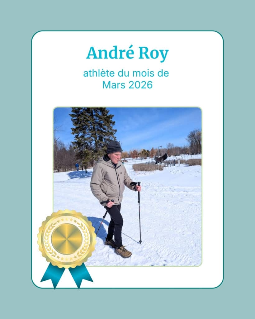 Chaque semaine, peu importe la météo, Monsieur Roy est fidèlement au rendez-vous pour ses séances de marche nordique au parc Michel-Chartrand. Sa constance et son engagement font de lui un véritable exemple de persévérance.Toujours appliqué, il s’investit pleinement dans chaque séance. Sa rigueur et sa volonté de se dépasser se démarquent : il est souvent volontaire pour en faire davantage et relever de nouveaux défis.